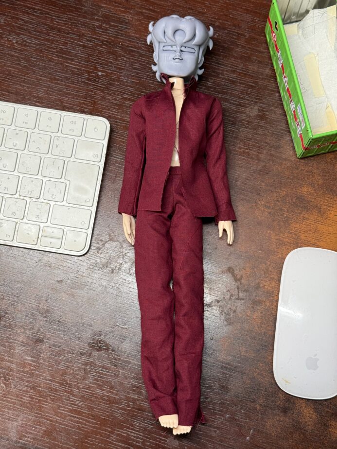顔が完成しないうちに服を仮縫いしたのは、全体のバランスを見るためです。んー、もっとあたまでかくしたい。これだと、かわいいけど かわいいマスコット人形であって零くんではない。